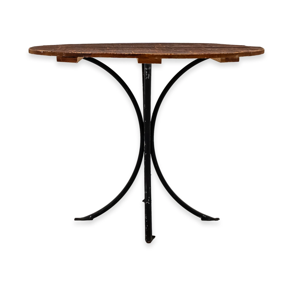 Mesa redonda em madeira, com pé em ferro. Ideal para jardim